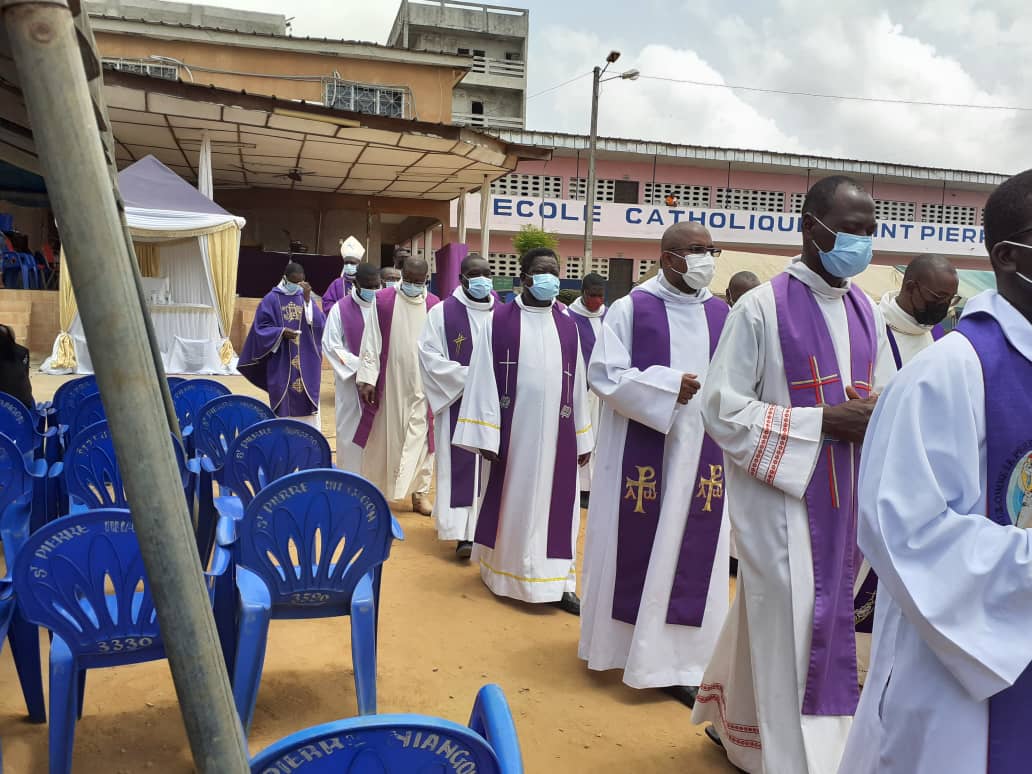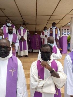 L’office des défunts fut dirigé par les novices avec de très belles mélodies suivie de la messe de requiem présidée par Mgr Jacques AHIWA ASSANVO, auxiliaire du Diocèse de Bouaké et concélébrée par plus de quarante prêtres venus nous soutenir.