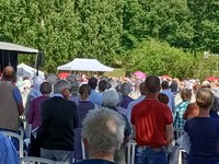 Ce samedi 4 juin 2022, à la chartreuse de Bosserville - près de Nancy - , nous étions environ 400 chrétiens (13 soeurs de la Doctrine) venus des quatre coins du diocèse, en bus, en voitures, en vélos, à pieds à répondre à l'invitation de Mgr Papin. Le soleil était au rendez-vous, la bonne humeur, la joie de retrouver des visages connus. Tous, nous venions pour rendre grâce pour les 23 ans d'épiscopat de Mgr Papin et pour clôturer le thème pastoral triennal "repartir du Christ".