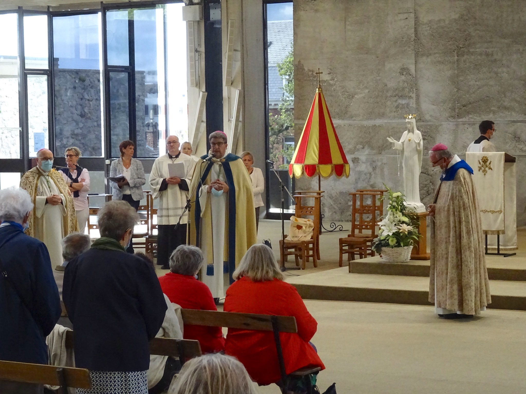 Cette belle messe festive a été présidée par Mgr Eric de Moulins-Beaufort, archevêque de Reims, et parmi les concélébrants, on notait la présence de Mgr Warin, évêque de Namur, et Mgr Léon Wagener, évêque auxiliaire de Luxembourg. Aux premiers rangs, une place particulière a été reservée aux victimes de la tornade de Beauraing et des intempéries de cet été en Belgique.