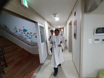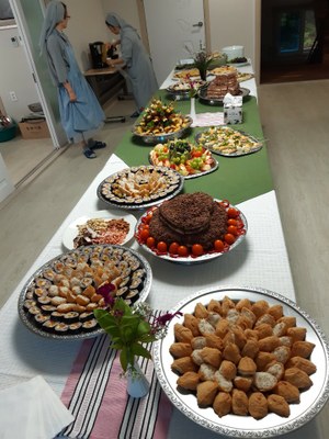 Pour ce jour, sœur Perpétua Ju, aidée par des bénévoles croyants a tapissé les murs de beaux dessins l’été dernier et sœur Véronica Kim avait préparé un apéritif et toutes sortes de plats pour 80 ou 90 personnes