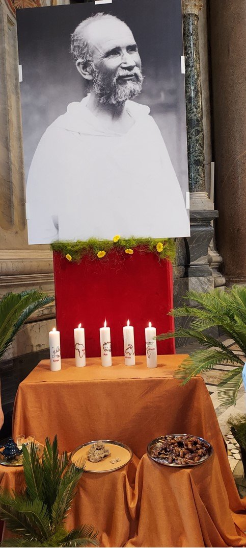 Cette fraternité universelle fut également le fil rouge tout au long de la très belle Messe d'action de grâce le lundi 16 mai dans la Basilique Saint-Jean-de- Latran, présidée par le Cardinal Angelo de Donatis, Vicaire général du Pape François et proche de la famille de Charles de Foucauld ! Près du portrait de Charles de Foucauld, se trouvaient 5 cierges, et sur chacun la carte d'un des 5 continents; pour représenter l'Algérie où il a vécu, un plateau avec des dattes, un autre avec du sable et un 3° avec un service à thé.
