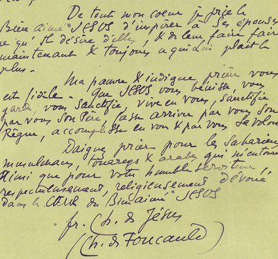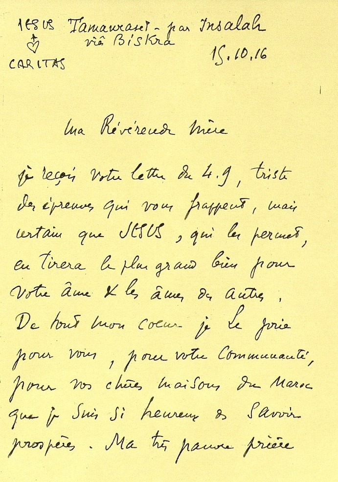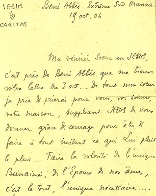 C'est près de Béni Abbès que me trouve votre lettre du 3 octobre. De tout mon cœur je prie et prierai pour vous, vos sœurs, votre maison, suppliant Jésus de vous donner grâce et courage pour être à faire à tout instant ce qui Lui plait le plus. Faire la volonté de l’unique Bien aimé, de l’Epoux de nos âmes, c’est le tout,  l’unique nécessaire…"