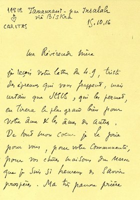 Je reçois votre lettre du 4.9, triste des épreuves qui vous frappent, mais certain que Jésus, qui les permet, en tirera le plus grand bien pour votre âme et les âmes ou autres. De tout mon cœur je Le prie pour vous, pour votre communauté, pour vos chères maisons du Maroc que je suis si heureux de savoir prospères."