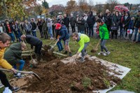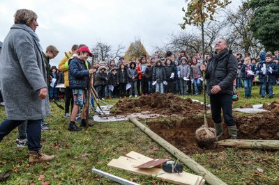 Avant que résonne la Brabançonne, Mr Bernard, directeur de l’école, s’est adressé à l’assemblée : « Cet arbre grandira sous nos yeux, nous rappellera que la paix est à construire chaque jour de notre vie ».