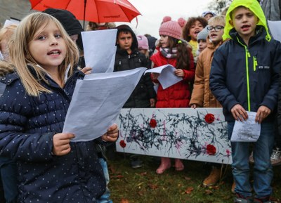 De nombreuses personnes avaient rejoint les enfants : des parents, le Maire, une Association patriotique, une classe de l’Athénée, les membres du Pouvoir Organisateur de l’école, ….