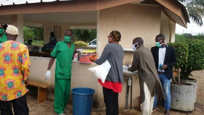 - Le personnel de service est chargé de sensibiliser toutes les personnes venant au centre de soins à se laver les mains ; des affiches (en français et en langue locale) recommandent l'hygiène de vie.