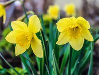Derrière : la nature explose : forsythias, jonquilles, pommiers du Japon, arbres fruitiers en fleurs…