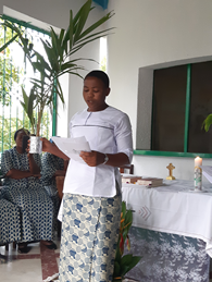 Le palmier est un arbre qui a beaucoup de qualités. Il est heureux de ce qu’il est. Il donne sa vie pour nourrir les hommes et les animaux. Il est apprécié non seulement à cause de son huile de palme, mais surtout à cause des nombreuses vertus dont il regorge. De la racine aux noix, le palmier est source de nombreux biens et remèdes : les noix de palmes, le vin de palme, les rameaux que nous utilisons pour la clôture et la toiture, les brindilles pour les balais. Comme le palmier, je voudrais moi aussi donner du fruit pour les autres. Postulante Francisca LENZA