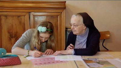 Sœur Marie Madeleine a 83 ans. Elle a commencé à enseigner à l'Institut Notre Dame de Beauraing en 1956, jusqu'à l'âge de 60 ans. C'était la limite légale imposée par la ministre de l'enseignement de l'époque, Laurette Onkelinx. Alors, Sœur Madeleine a décidé de rester active pour l'école, d'abord à la bibliothèque, ensuite pour de la remédiation, en français. Une matière qu'elle continue à transmettre à des élèves non francophones.