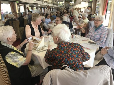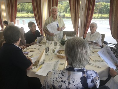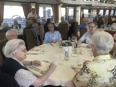 Ce mardi 11 septembre, un groupe de 47 sœurs s’est retrouvé à l’invitation des Maisons de Retraite de la Doctrine pour l’excursion déjà traditionnelle sur la « Marie-Astrid ». Par un temps exceptionnellement beau, nous avons pu admirer les vignobles du côté luxembourgeois et allemand, où la récolte a commencé trois semaines plus tôt que d’habitude. On nous promet un très bon cru ! Un petit vent frais permettait de se tenir sur le pont du bateau pour une petite sieste ou pour un échange. Sœur Marthe Bock, qui avait organisé cette excursion, a fourni aux participantes un dossier d’informations sur la Moselle, ses vins, ses bateaux, ses villes.