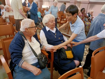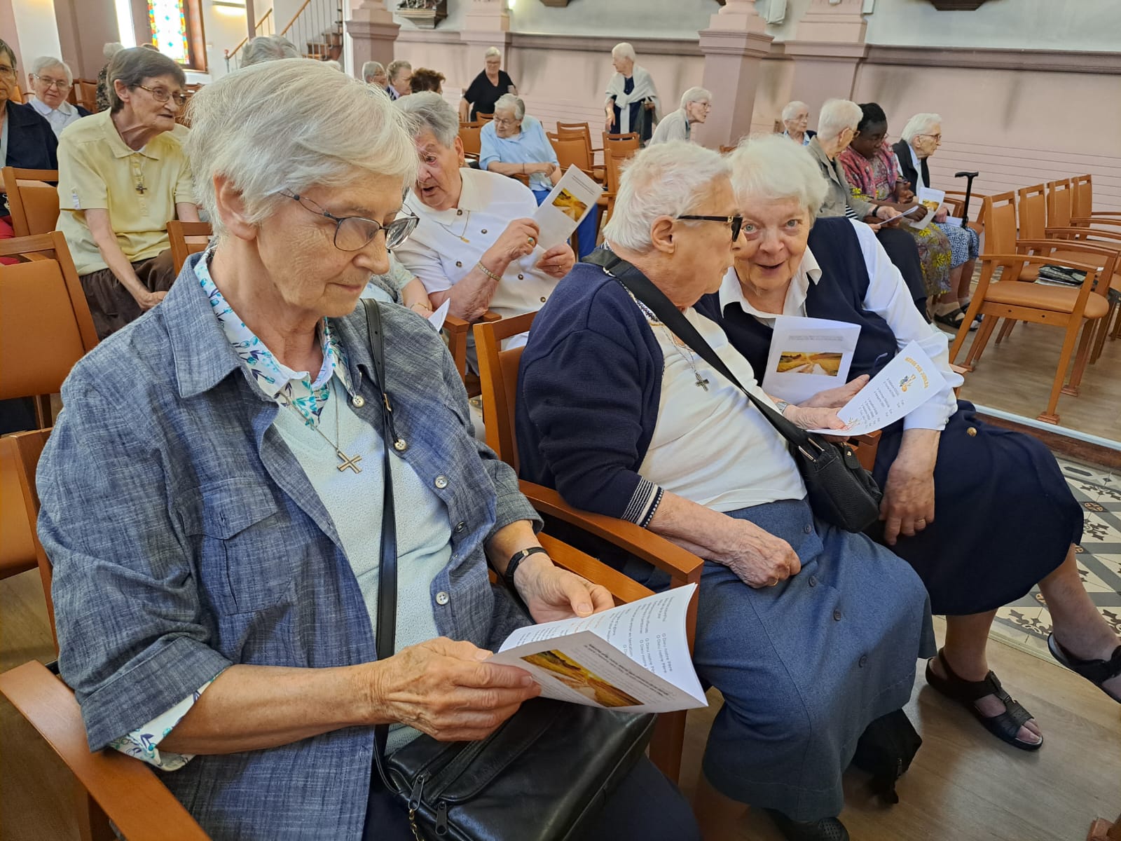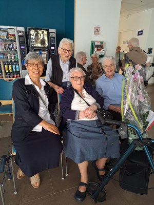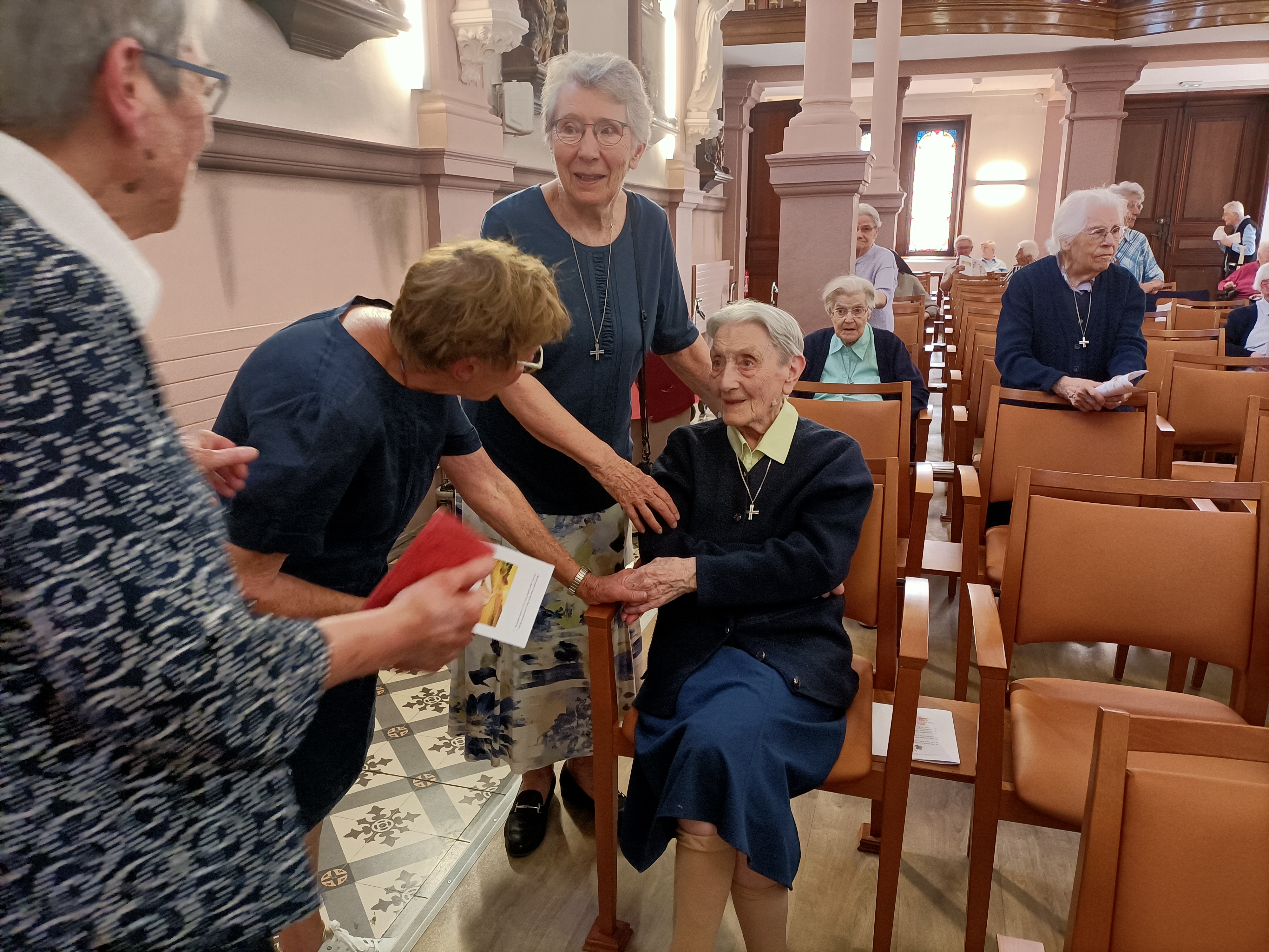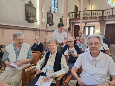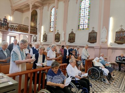 C'est un rendez-vous, le vendredi 2 juin 2023, à notre Maison Saint Joseph, avenue de Strasbourg à Nancy, pour fêter les Jubilaires, d'abord par une messe d'action de grâce, dans la chapelle, illuminée par les vitraux ensoleillés, les cierges, égayée par les robes multicolores, les cheveux argentés et au son d'une joyeuse musique interprétée par M. Catella ainsi que les chants animés par M. Schweiger.