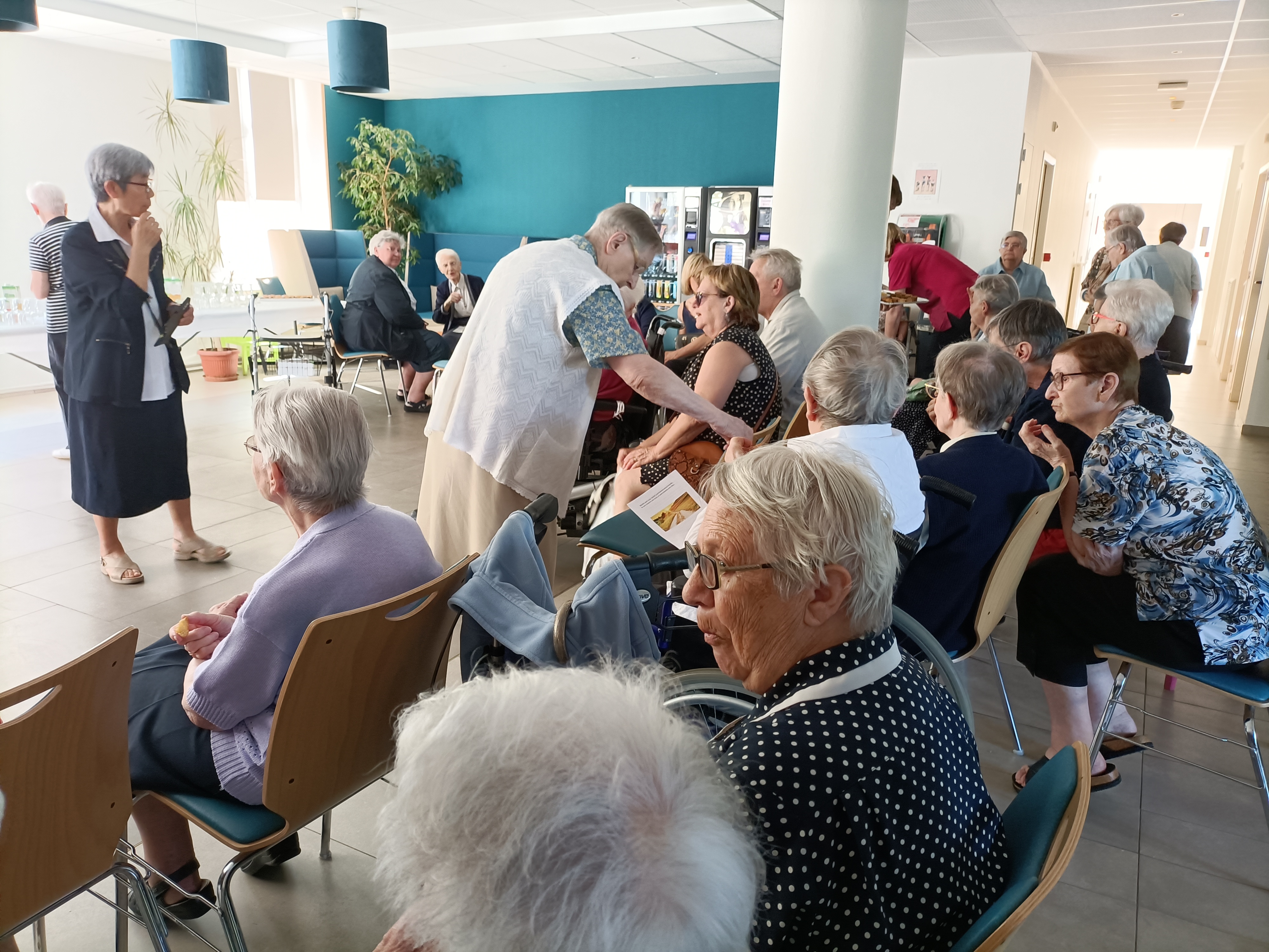 Après la célébration, la fête continue par une rencontre fraternelle, dans le hall d'accueil, en présence de M. Renaudin, directeur de l'EHPAD, autour de délicieux amuse-bouche, sucrés, salés, bien arrosés, servis par les employés, tandis que chacune pouvait bavarder amicalement avec les Jubilaires.