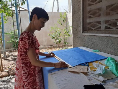 Dans cet engagement, notre sœur Fabiola de passage à Bouaké n’est pas en reste car, comme le bon maitre, elle a su « nouer son tablier » pour se mettre au service du peuple ivoirien par amour pour lui. Elle participe à couper les masques et à former des plis. Sa participation favorise non seulement un bon rendement dans le travail, mais elle est surtout une source d’encouragement pour nous.