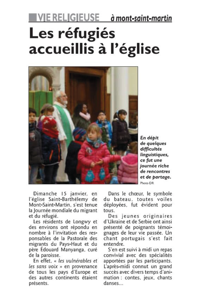 Dimanche 15 janvier 2017 en l'église St Barthélemy s'est tenue la journée mondiale du migrant et du réfugié. Les résidents de Longwy et des environs ont répondu en nombre à l'invitation des responsables de la Pastorale des migrants du Pays Haut. Une journée riche : le bateau toutes voiles déployées fut évident pour tous, des jeunes d'Ukraine et de Serbie ont témoigné, un repas convivial et une après-midi jeux, chants, danses.