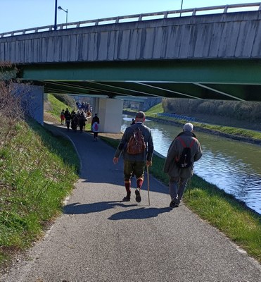 A 13 h 30, 120 pèlerins se mettaient en route, sous le soleil, pour 15 kms de marche, dans un climat fraternel, chacun à son rythme.