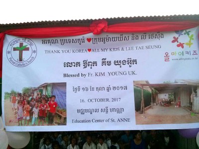 Heureusement, grâce à l’aide d’une famille bénévole de l’association All my kids, une ONG catholique, nous avons pu aménager un espace à côté de la maison, en comblant de terre le sol enfoncé et rempli d’eau et en recouvrant cet espace d’un préau. Pour certains, c’ est encore minable, mais pour nous, c’est une salle parfaite. Beaucoup d’enfants s’y réunissent, c’est un miracle !