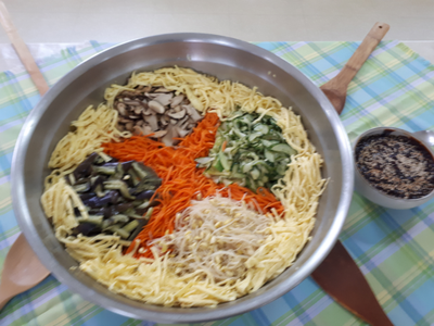 Le menu était  du « Bibim-bap », il s'agit de riz, de viande de bœuf, de légumes sautés ou blanchis,  assaisonnés, et d'un œuf sur le plat, le tout relevé par de la pâte de piment coréen fermenté.