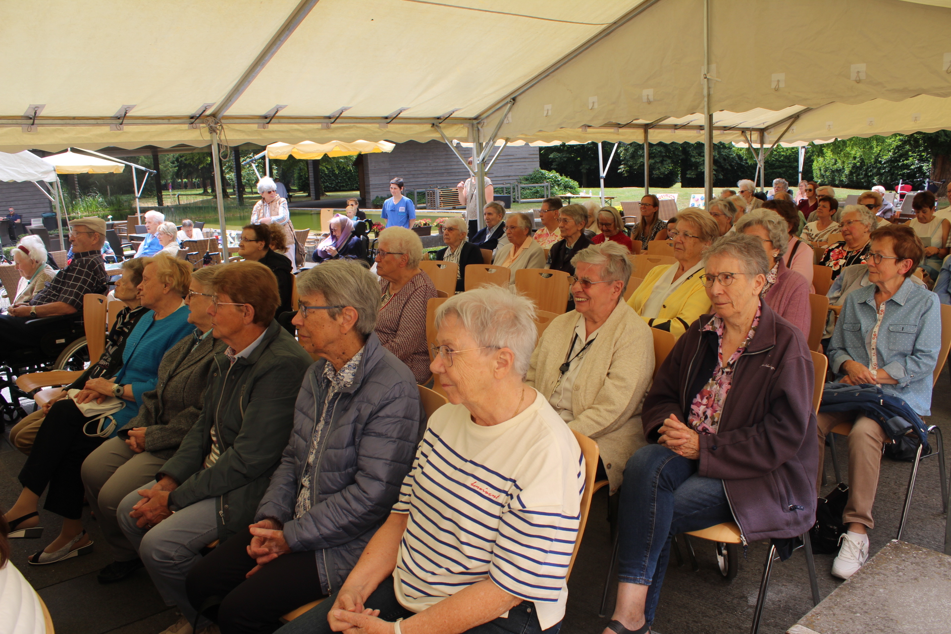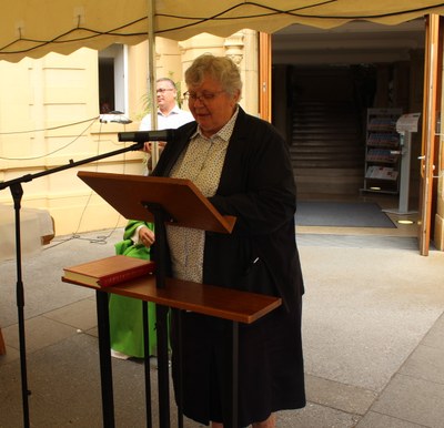 Sœur Danièle a enchainé pour remercier d’abord tout le personnel qui s’occupe avec soin des pensionnaires et de la maison et réussit ainsi à créer une ambiance dans laquelle il fait bon vivre. Ensuite elle a rappelé la raison pour laquelle l’Asbl a été créée et tout ce qu’elle a réalisé au cours de ces 30 années. Enfin elle a expliqué que du fait que Heisdorf dispose d’un parc magnifique il était évident pour la Maredoc d’accueillir dans son enceinte le Tricentenaire et d’offrir cette même chance à ces « personnes en situation de handicap ».