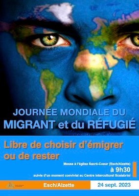 Le dimanche 24 septembre 2023, à l’initiative de « Reech eng Hand - Tends une main » et des Scalabriniens du Luxembourg, la 109e Journée Mondiale du Migrant et du Réfugié a été organisée à Esch-sur-Alzette. « Libre de choisir d’émigrer ou de rester » a été le thème choisi par le Saint-Père cette année. Le Pape François souhaitait promouvoir une réflexion sur le droit de n’avoir pas à émigrer, ou en d’autres termes, le droit de pouvoir rester sur sa terre.