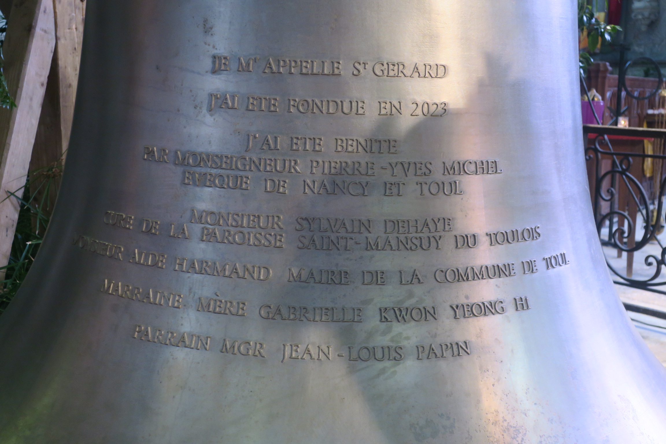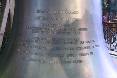 La cloche la plus importante, St Gérard, avait pour parrain Mgr Papin évêque émérite de Nancy-Toul et Sr Gaby, notre Supérieure générale, comme marraine.