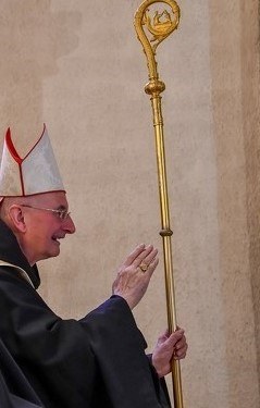 Les évêques, à tour de rôle, se tiennent au-dessus de l’escalier pour bénir les groupes de pèlerins.