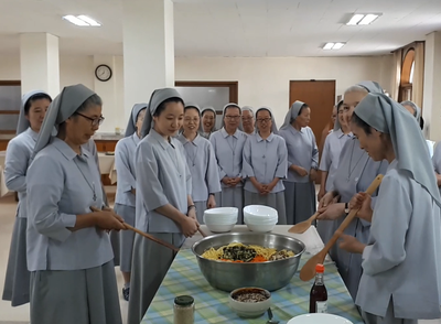 가브리엘 수녀님과 파비올라 수녀님이 커다란 스텐 그릇에 담겨 있는 밥과 각종 야채를 고추장과 참기름을 넣고 버무렸습니다.